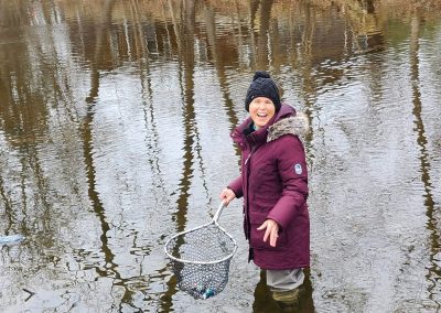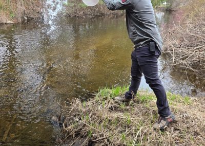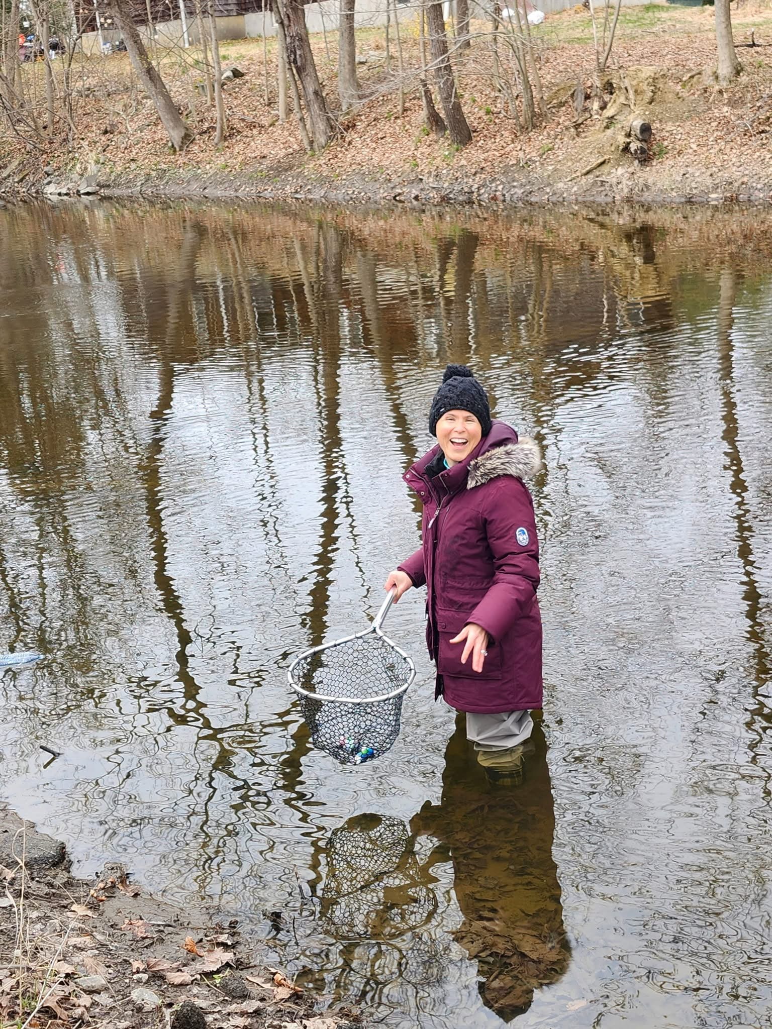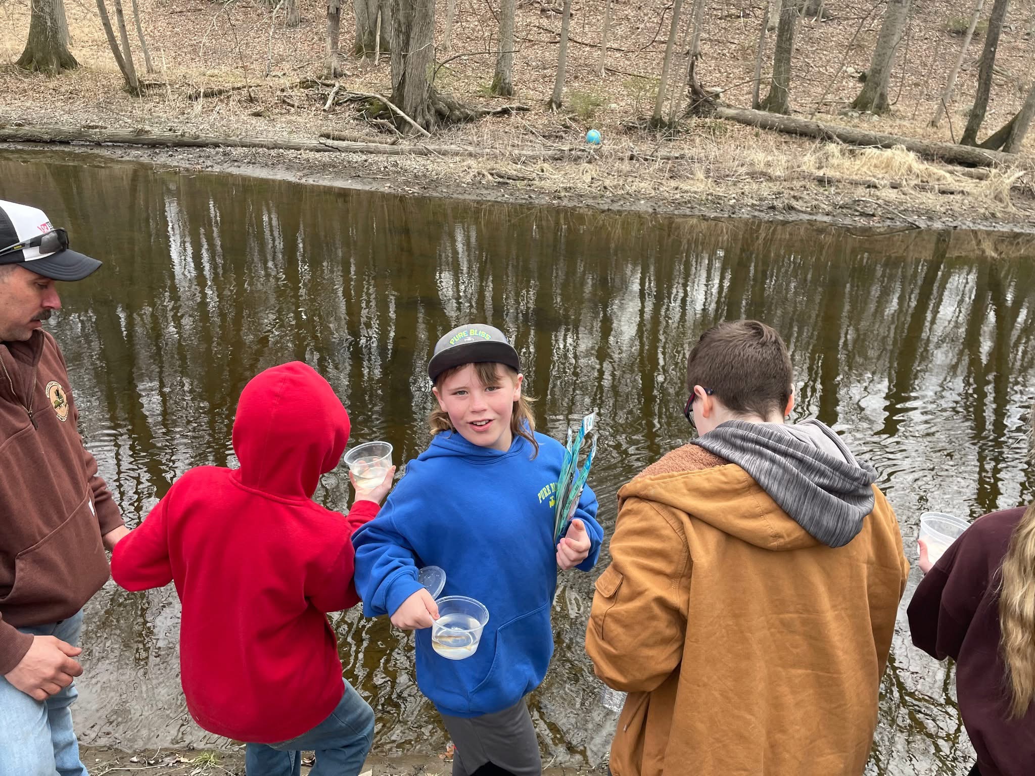 Mason Bliss releasing a raised trout into Tin Brook