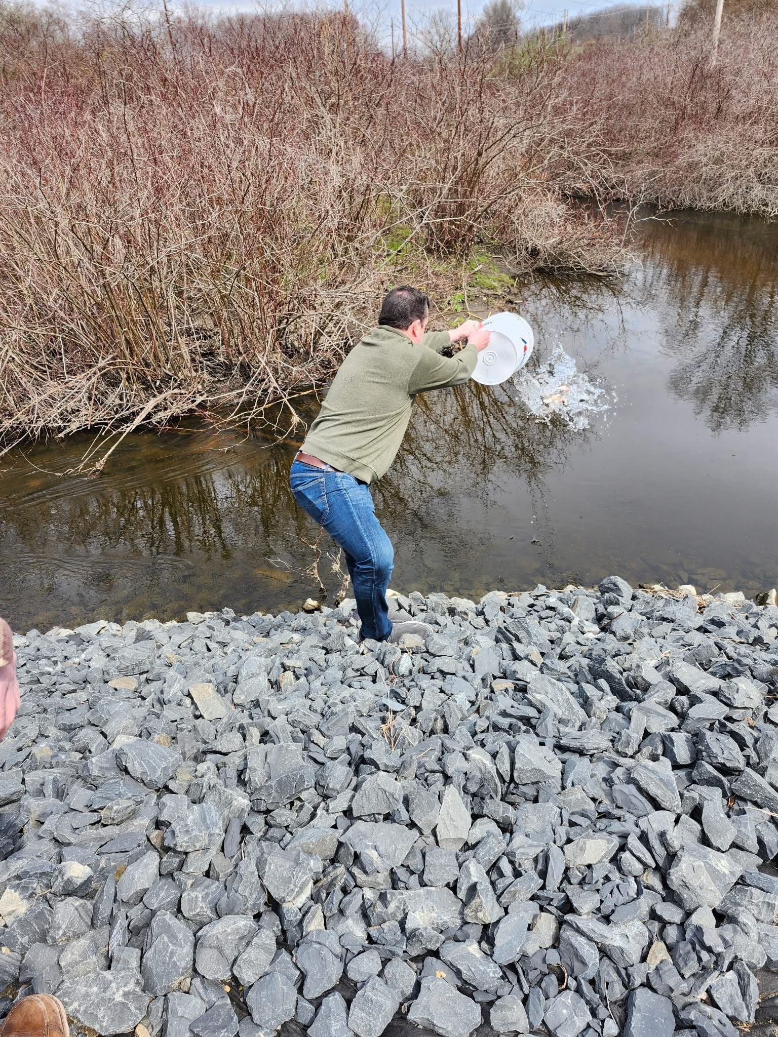 Village manager John Revella releasing trout into the Tin Brook